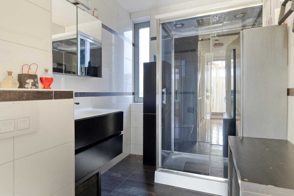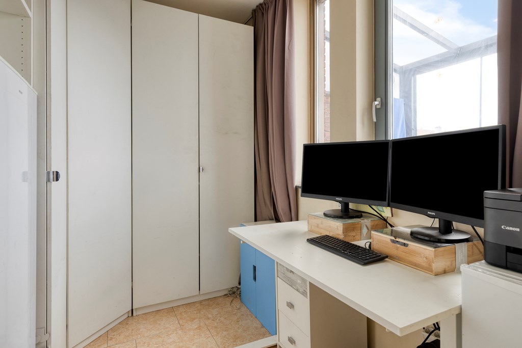 Via de overloop heb je toegang tot 2 slaapkamers, de badkamer en het terras met serre op het Zuid-Westen. De slaapkamers zijn respectievelijk 4,2*3,0m2 en 2,1*3,0m2 groot. De badkamer is voorzien van een douche, toilet en wastafelmeubel.