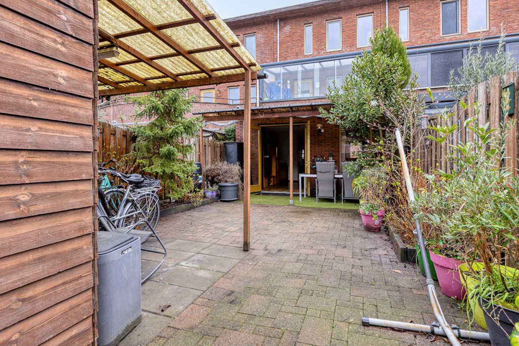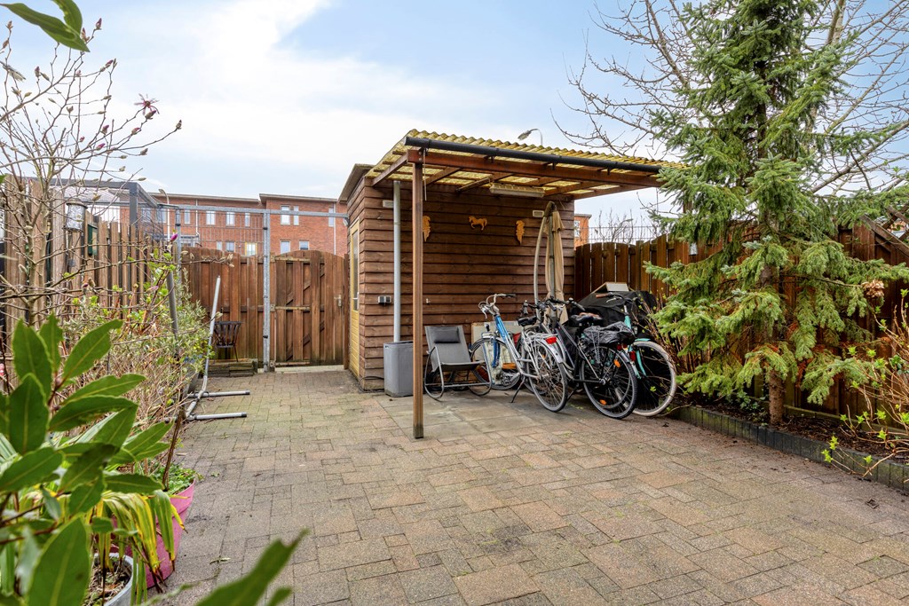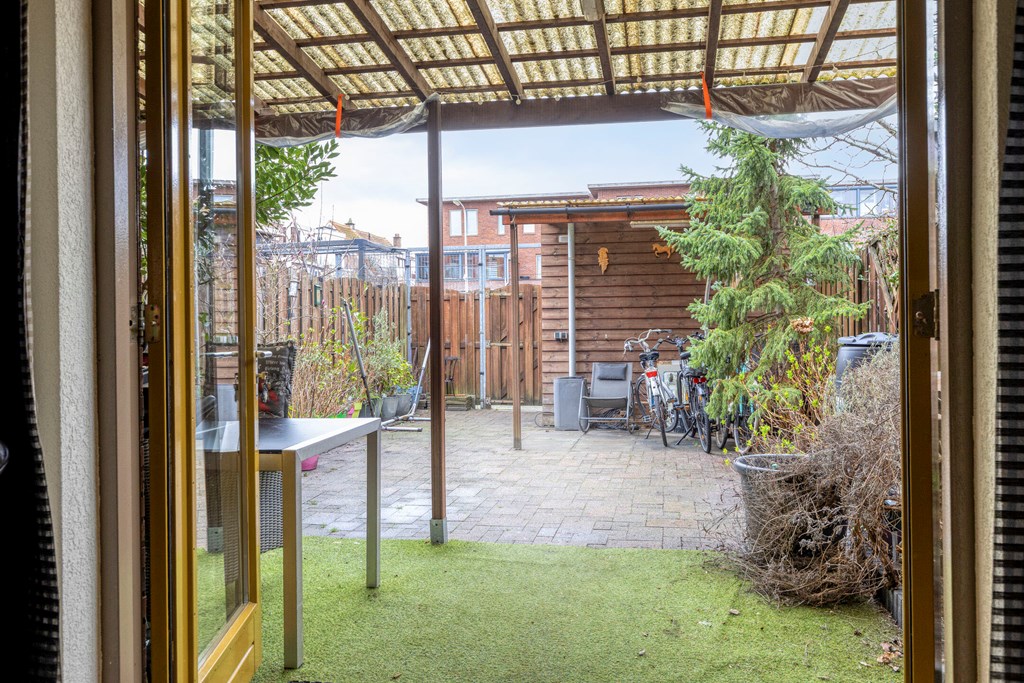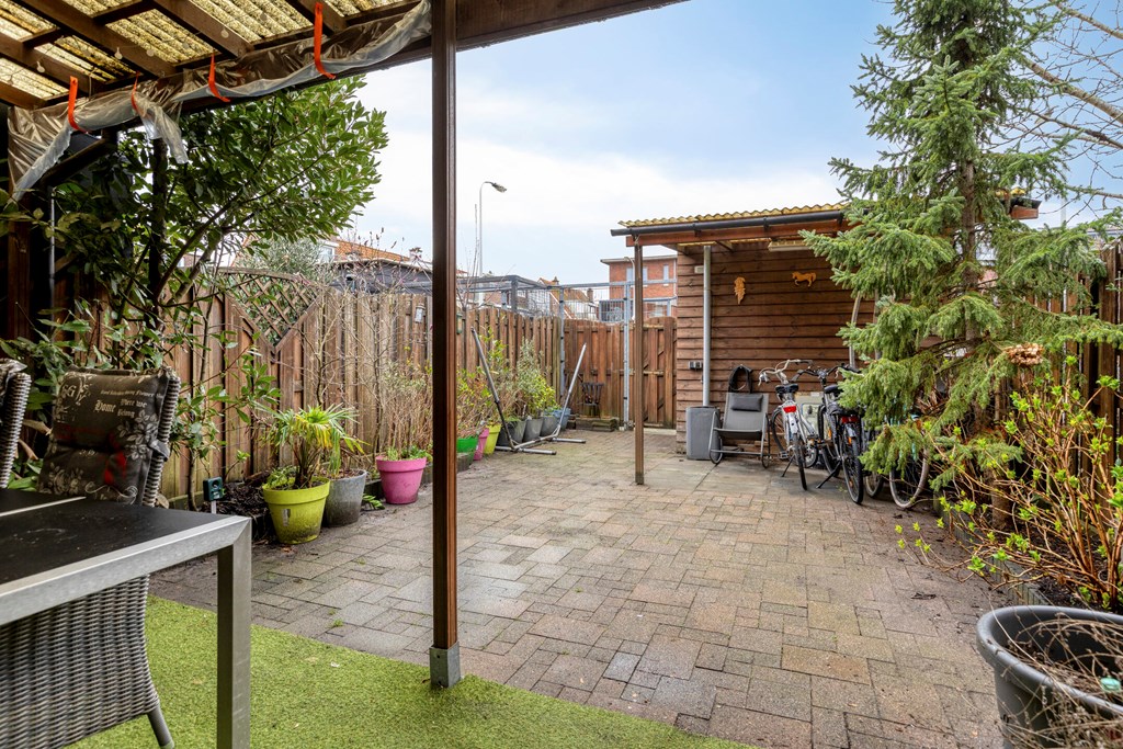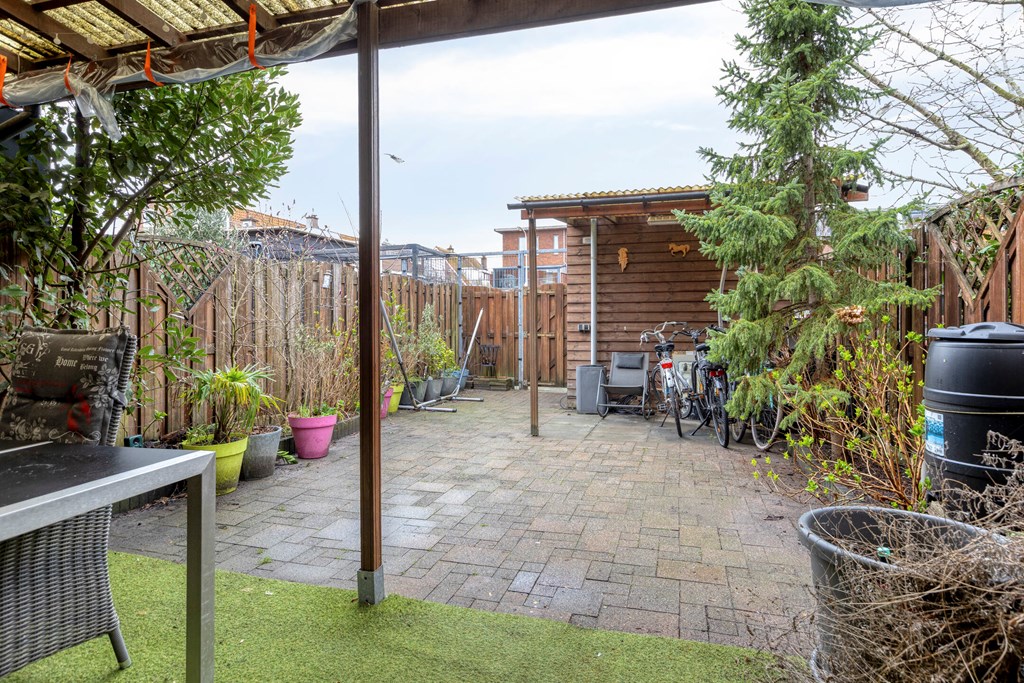 Achtertuin van 13,6*5,4m op het Zuid-Westen, met overkapping, vrijstaande schuur en een achterom naar de eigen parkeerplaats op afgesloten terrein.