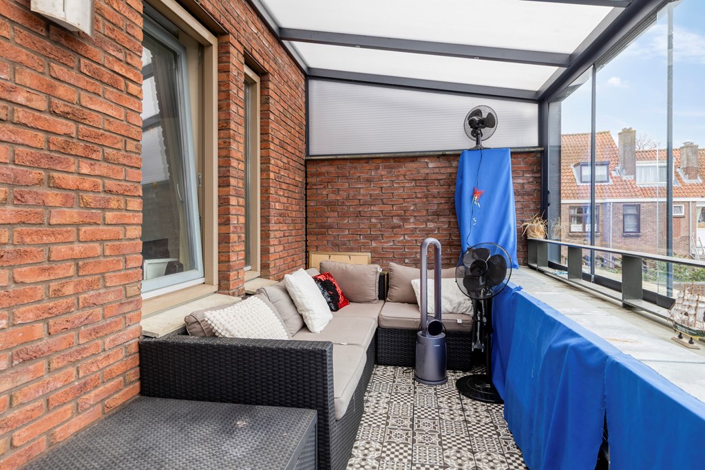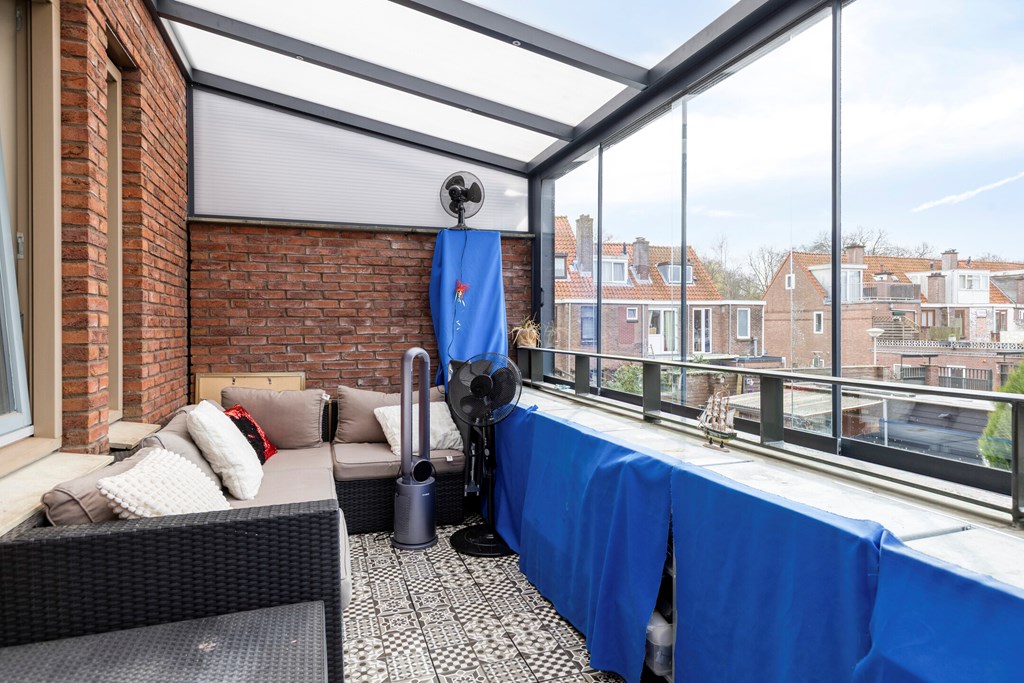 Terras met serre van ca. 5,2*2,3m2 op de eerste verdieping, op het Zuid-Westen gelegen.