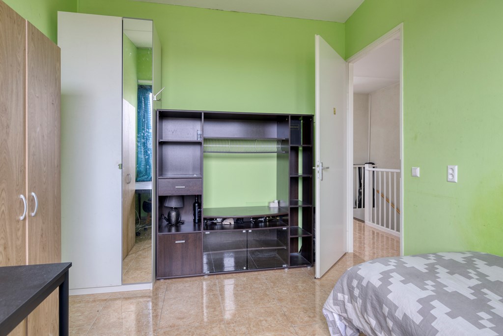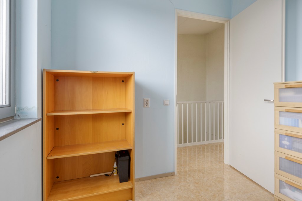 Met de vaste trap bereiken we de tweede verdieping. Vanuit deze verdieping heb je toegang tot nogmaals 2 slaapkamers en een wasruimte. De twee slaapkamers zijn respectievelijk 3,8*3,0m2 en 2,6*3,0m2 groot. In de wasruimte staat de opstelling van de wasmachine/droger.